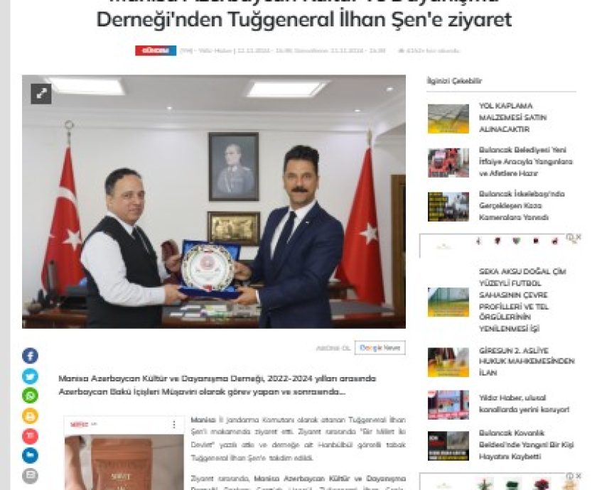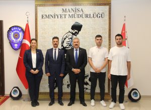 Manisa Azerbaycan Kültür ve Dayanışma Derneği Başkanı Şentürk Hoşgül ve beraberinde heyet Manisa İl Emniyet Müdürü Fahri Aktaş’ı makamında ziyaret etti. Ziyarette Başkan Şentürk Hoşgül’e, Kadın Kollarını temsilen Filiz Kayatepe, Engelli Komisyonunu temsilen Onur Döşeme Uluslararası Öğrenci Topluluğunu ve Manisa Azerbaycanlı Talebeler Topluluğunu temsilen Fatih Solmaz katıdı. Başkan Şentürk Hoşgül gerek Manisa Azerbaycan Kültür ve Dayanışma Derneğinin gerekse de Üyesi oldukları Türkiye Azerbaycan Dernekleri Federasyonu (TADEF) çalışmaları hakkında bilgiler paylaştı ve günün anısına İl Emniyet Müdürü Fahri Aktaş’a Bakü Şehrinin görselinin bulunduğu tabağı takdim etti.