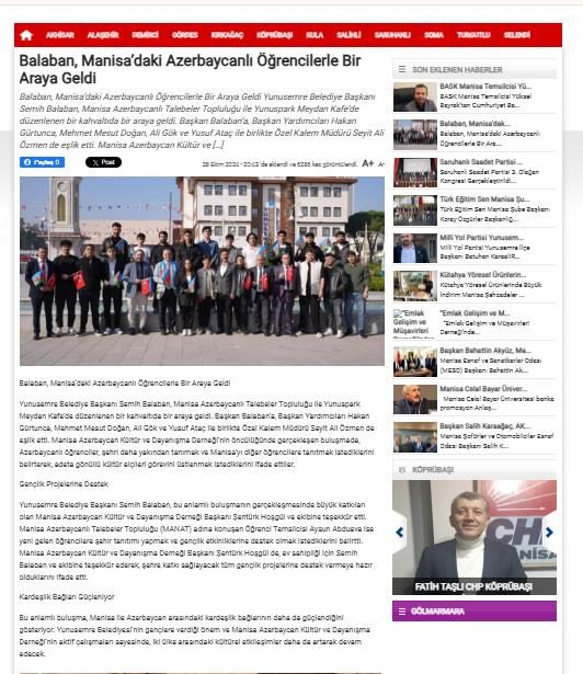 Yunusemre Belediye Başkanı Semih Balaban, Manisa Azerbaycanlı Talebeler Topluluğu ile Yunuspark Meydan Kafe’de düzenlenen bir kahvaltıda bir araya geldi. Başkan Balaban’a, Başkan Yardımcıları Hakan Gürtunca, Mehmet Mesut Doğan, Ali Gök ve Yusuf Ataç ile birlikte Özel Kalem Müdürü Seyit Ali Özmen de eşlik etti. Manisa Azerbaycan Kültür ve Dayanışma Derneği’nin öncülüğünde gerçekleşen buluşmada, Azerbaycanlı öğrenciler, şehri daha yakından tanımak ve Manisa’yı diğer öğrencilere tanıtmak istediklerini belirterek, adeta gönüllü kültür elçileri görevini üstlenmek istediklerini ifade ettiler.