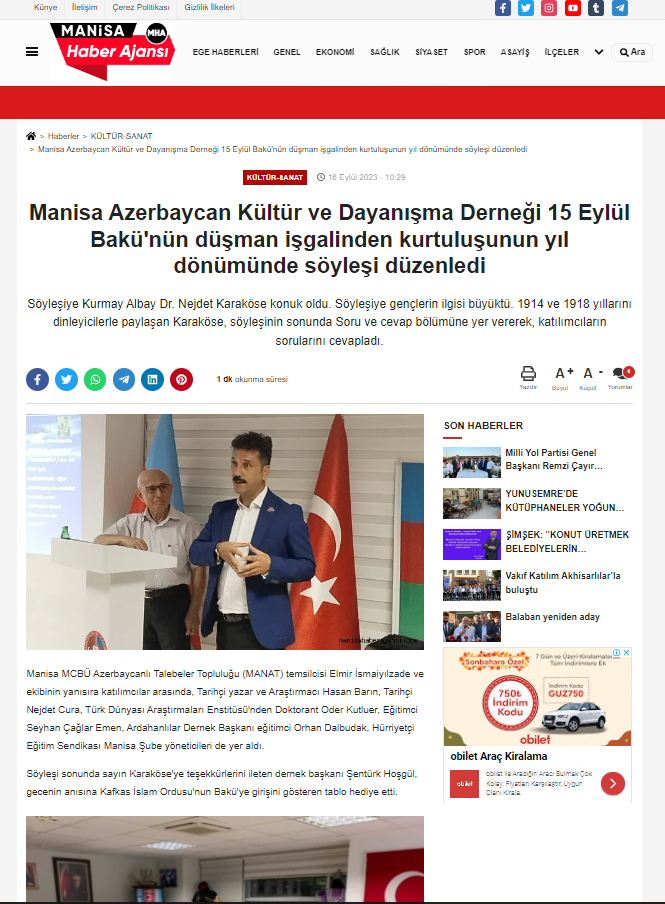 Manisa Azerbaycan Kültür ve Dayanışma Derneği 15 Eylül Bakü’nün düşman işgalinden kurtuluşunun yıl dönümünde söyleşi düzenledi16 Likes